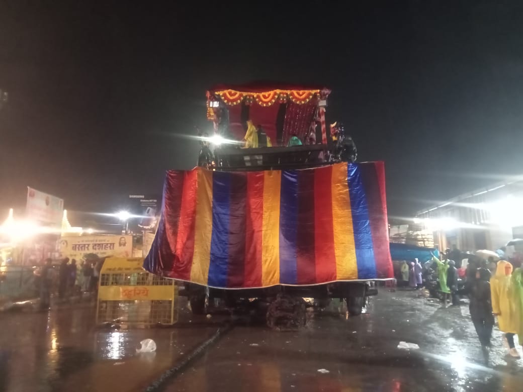 इस विशाल रथ को मावली मंदिर, जगन्नाथ मंदिर, गोल बाजार चौक, गुरु नानक चौक होते हुए दंतेश्वरी मंदिर तक परिक्रमा कराई गई। इस विशाल आठ चक्के के विजय रथ में जहां दंतेश्वरी मां की डोली और छत्र विराजमान थी, वहीं इसके सामने सुसज्जित वाहन में दंतेवाड़ा से आई मावली मां की डोली और छत्र विराजमान थी। रथ के सामने बस्तर संभाग के विभिन्न क्षेत्रों से दशहरा में पहुंचे देवी-देवताओं के छत्र, डोली, और लाठ लिए पुजारी, सेवक चल रहे थे वहीं आंगादेव पूरे मार्ग पर दौड़ते हुए मार्ग के अवरोध हटाने में जुटे नजर आए। इस विहंगम दृश्य को देखने के लिए विभिन्न क्षेत्रों से आए ग्रामीणों के साथ ही नागरिकगण भी जुटे रहे। लगातार हो रही बारिश के बीच भी बस्तर दशहरे का आकर्षण एवं वैभव नजर आया।