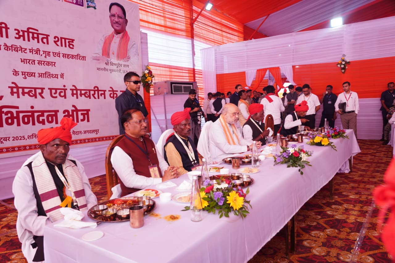 जगदलपुर = 04 अक्टूबर 2025 केन्द्रीय गृहमंत्री श्री अमित शाह आज अपने एक दिवसीय प्रवास पर बस्तर पहुंचे थे। लालबाग में आयोजित कार्यक्रम स्थल पर बस्तर दशहरा से सम्बंधित मांझी-चालकी, मेम्बर एवं मेम्बरीन के साथ अभिनंदन भोज किया। इस भोज में क्षेत्र के पारम्परिक व्यंजनों कों समाहित किया गया था, जिसकी प्रशंसा केंद्रीय गृह मंत्री श्री शाह ने किया।