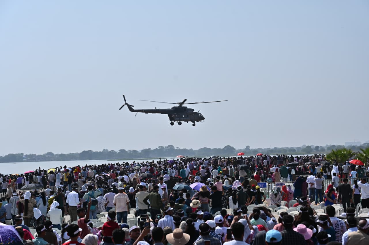 रायपुर = 5 नवम्बर छत्तीसगढ़ राज्य स्थापना की 25वीं वर्षगांठ पर आज नवा रायपुर के सेंध जलाशय के ऊपर भारतीय वायु सेना की प्रतिष्ठित एरोबेटिक “सूर्यकिरण” की टीम ने रोमांचक एयर शो का प्रदर्शन किया। देश के उप राष्ट्रपति सी.पी. राधाकृष्णन, राज्यपाल रमेन डेका, मुख्यमंत्री विष्णु देव साय और विधानसभा अध्यक्ष डॉ. रमन सिंह के साथ हजारों लोगों ने अद्भूत और रोमांचक एयर शो का आनंद लिया। आज प्रदेशवासियों के लिए वायु सेना का एयर शो कमाल का अनुभव रहा। सेंध जलाशय के ऊपर वायु सेना के फाइटर प्लेन्स ने एक के बाद एक कई हवाई करतब दिखाए। आसमान में पंछियों के झुंड की तरह बिल्कुल क्रम से उड़ने वाले फाइटर प्लेन्स के माध्यम से वायु सेना के जाबांजों ने अपने नियंत्रण और शौर्य का अद्भुत प्रदर्शन किया। विमानों के माध्यम से जब आकाश में तिरंगा लहराया तो सेंध जलाशय भारत माता की जय के नारे से गूंज उठा।