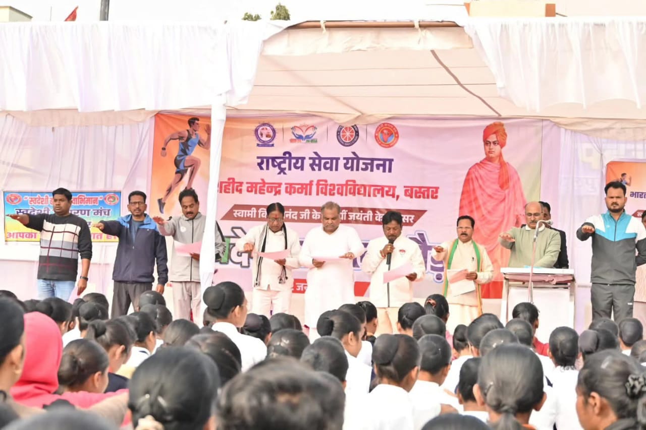 जगदलपुर =स्वामी विवेकानंद की जयंती एवं राष्ट्रीय युवा दिवस के पावन अवसर पर आज सोमवार को भारतीय जनता युवा मोर्चा, छत्तीसगढ़ द्वारा प्रदेशभर में आयोजित “स्वदेशी संकल्प दौड़ एवं स्वदेशी संकल्प सभा” का भव्य आयोजन किया गया। इस कड़ी में बस्तर संभाग के मुख्यालय जगदलपुर में यह कार्यक्रम माई दंतेश्वरी मंदिर प्रांगण सिरहासार में आज सुबह श्रद्धा, उत्साह और देशभक्ति के भाव के साथ सम्पन्न हुआ।