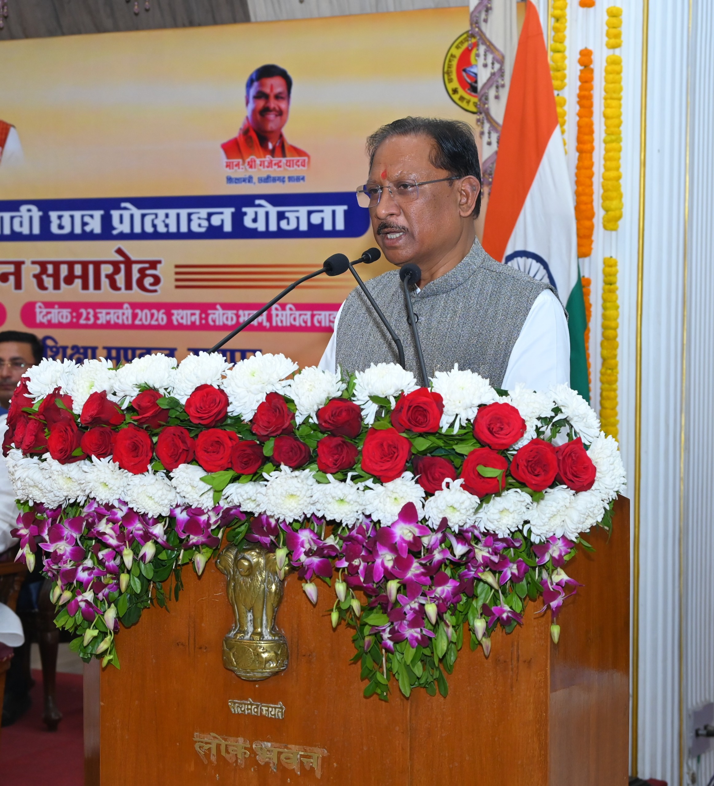 रायपुर =23 जनवरी 2026/राज्यपाल रमेन डेका के मुख्य आतिथ्य एवं मुख्यमंत्री विष्णुदेव साय की अध्यक्षता में आज लोक भवन में 10वीं एवं 12वीं के मेधावी विद्यार्थियों को सम्मानित किया गया। ये 2024 एवं 2025 के टॉप 10 मेधावी और विशेष पिछडी जनजाति के टॉप 01 विद्यार्थी है। स्कूल शिक्षा मंत्री गजेन्द्र यादव विशेष अतिथि के रूप में उपस्थित थे।