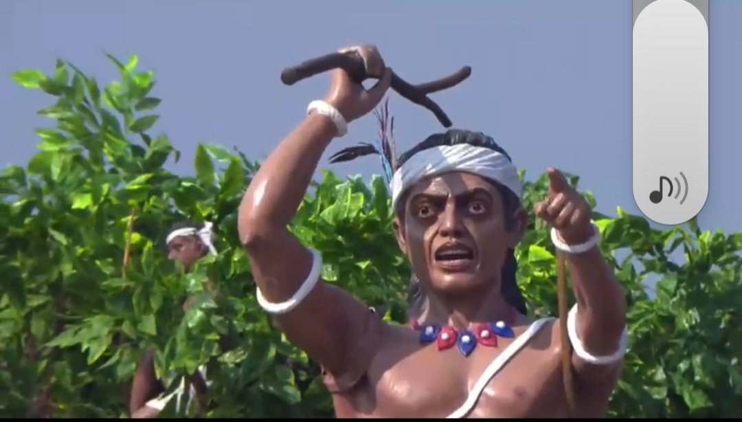 झांकी के अग्र भाग में वर्ष 1910 के ऐतिहासिक भूमकाल विद्रोह के नायक वीर गुंडाधुर को दर्शाया गया। धुर्वा समाज के इस महान योद्धा ने अन्यायपूर्ण अंग्रेजी शासन के विरुद्ध जनजातीय समाज को संगठित किया। विद्रोह के प्रतीक के रूप में आम की टहनियां और सूखी मिर्च को विशेष रूप से प्रदर्शित किया गया। विद्रोह की तीव्रता का अनुमान इसी से लगाया जा सकता है कि अंग्रेजों को नागपुर से सेना बुलानी पड़ी, फिर भी वे वीर गुंडाधुर को पकड़ने में असफल रहे।