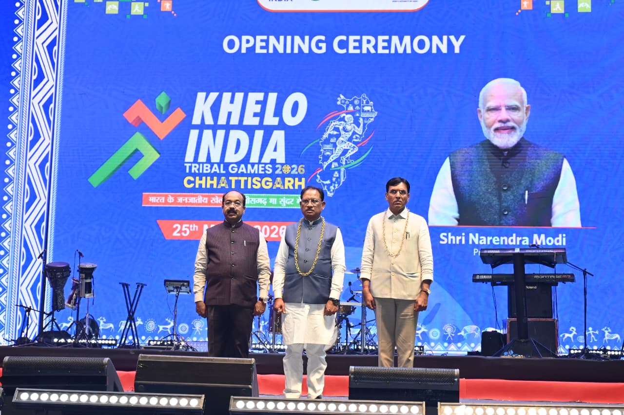 रायपुर =25 मार्च छत्तीसगढ़ की धरती आज एक ऐतिहासिक क्षण की साक्षी बनी, जब राजधानी रायपुर के साइंस कॉलेज ग्राउंड में देश के प्रथम ‘खेलो इंडिया ट्राइबल गेम्स 2026’ का भव्य शुभारंभ हुआ। मुख्यमंत्री श्री विष्णु देव साय ने इस राष्ट्रीय आयोजन की आधिकारिक घोषणा करते हुए स्पष्ट किया कि राज्य सरकार खेल प्रतिभाओं को आगे बढ़ाने और खेल अधोसंरचना को मजबूत करने के लिए पूर्णतः प्रतिबद्ध है। इस गरिमामयी अवसर पर केंद्रीय युवा मामले एवं खेल मंत्री डॉ. मनसुख मांडविया मुख्य अतिथि के रूप में उपस्थित रहे। यह खेल महाकुंभ 25 मार्च से 3 अप्रैल तक रायपुर के साथ-साथ बस्तर और सरगुजा में आयोजित किया जा रहा है, जिसमें देशभर के 30 राज्यों एवं केंद्रशासित प्रदेशों से लगभग 2500 खिलाड़ी 9 खेल विधाओं में अपनी प्रतिभा का प्रदर्शन कर रहे हैं। कार्यक्रम में हॉकी इंडिया के अध्यक्ष दिलीप तिर्की और ओलंपिक पदक विजेता सुश्री साइखोम मीराबाई चानू की गरिमामयी उपस्थिति ने आयोजन को विशेष गौरव प्रदान किया।